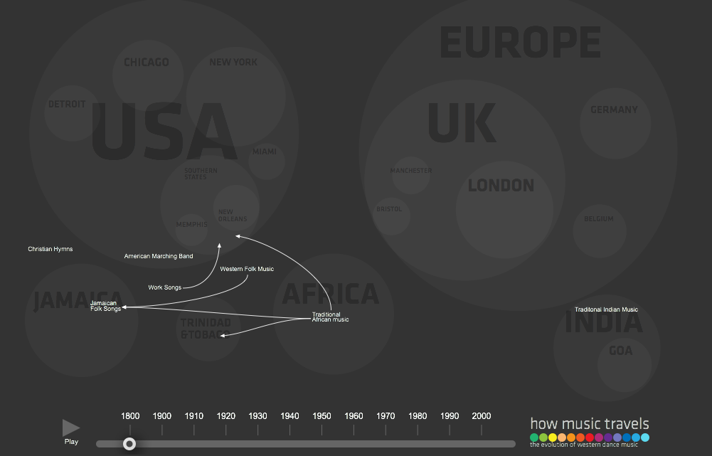地球上の国々がデフォルメされ配置された地図上に、音楽ジャンルの旅の軌跡が描かれる。その様子は時系列で変化し、1800年から2000年頃までの約200年間の変化を約15秒でみることができる。再生用のバーをスライドさせることで任意の年の状態をみることも可能だ。